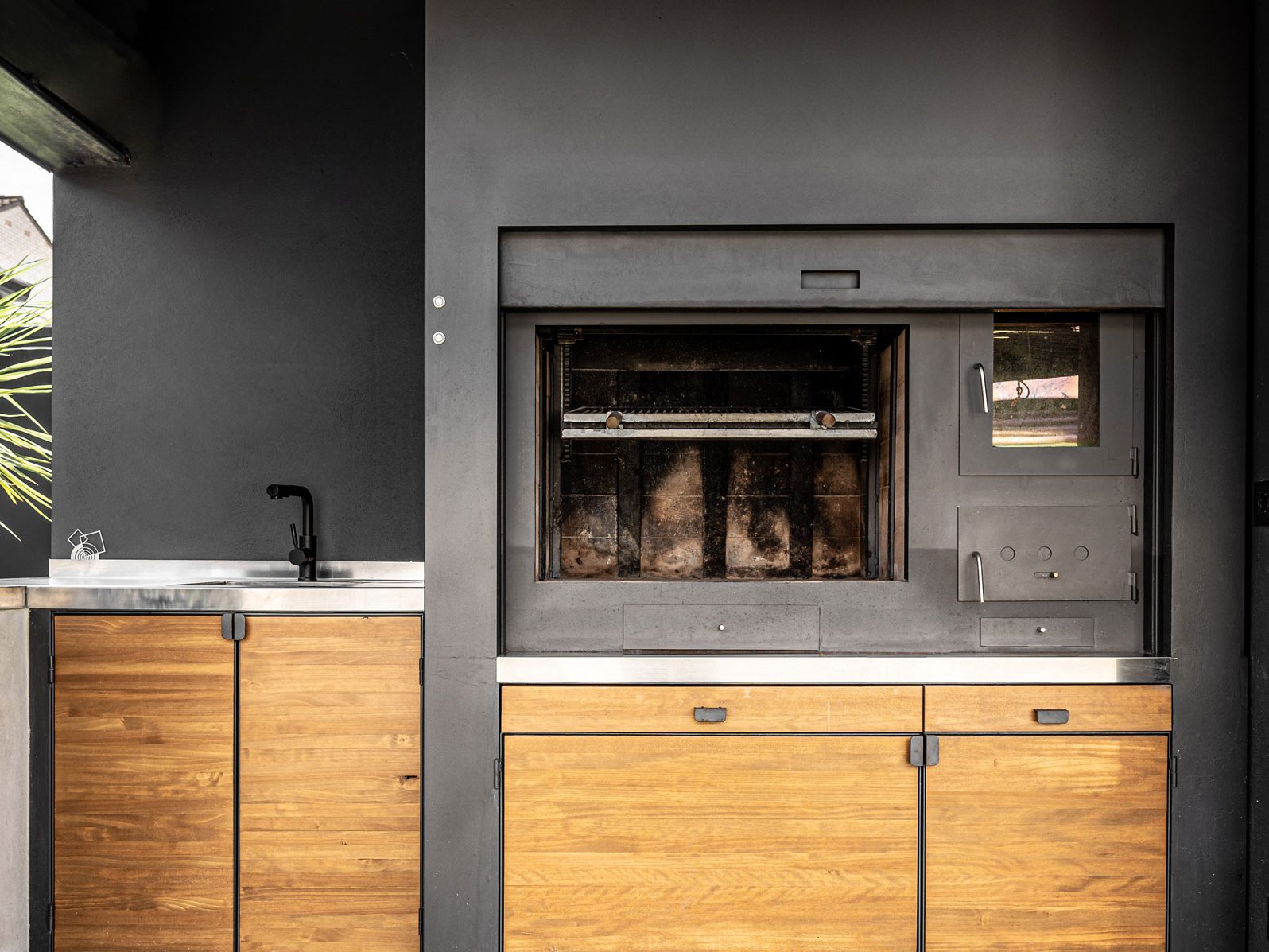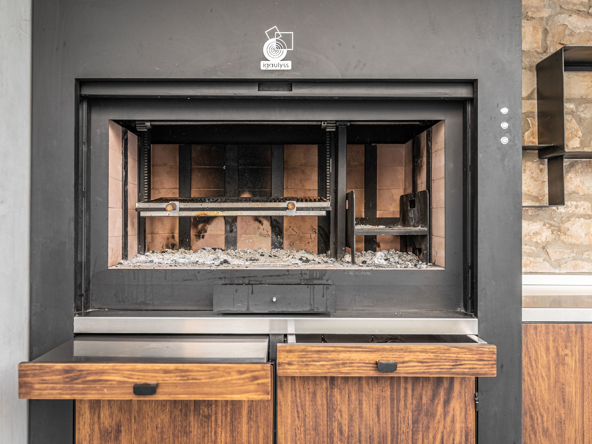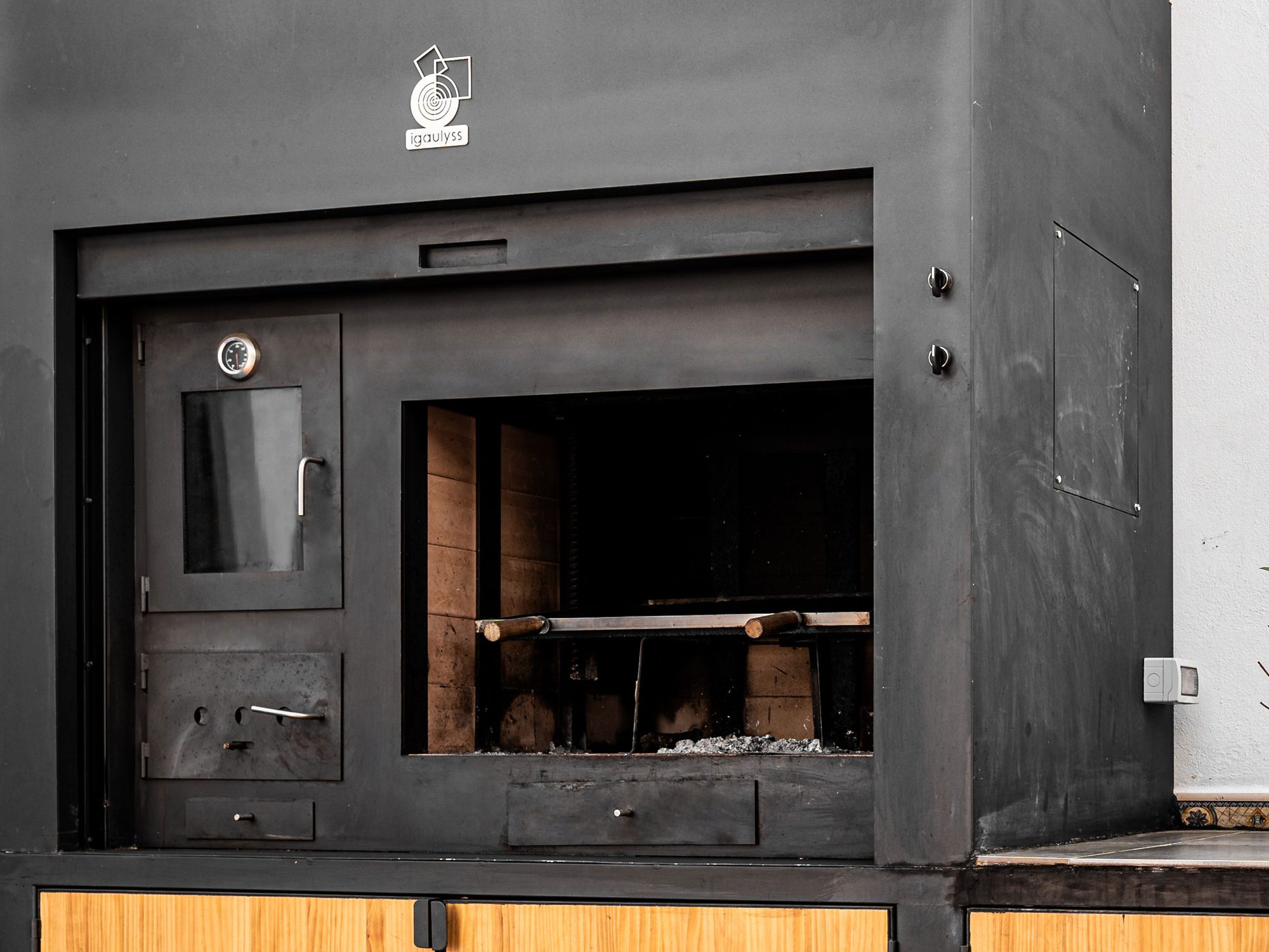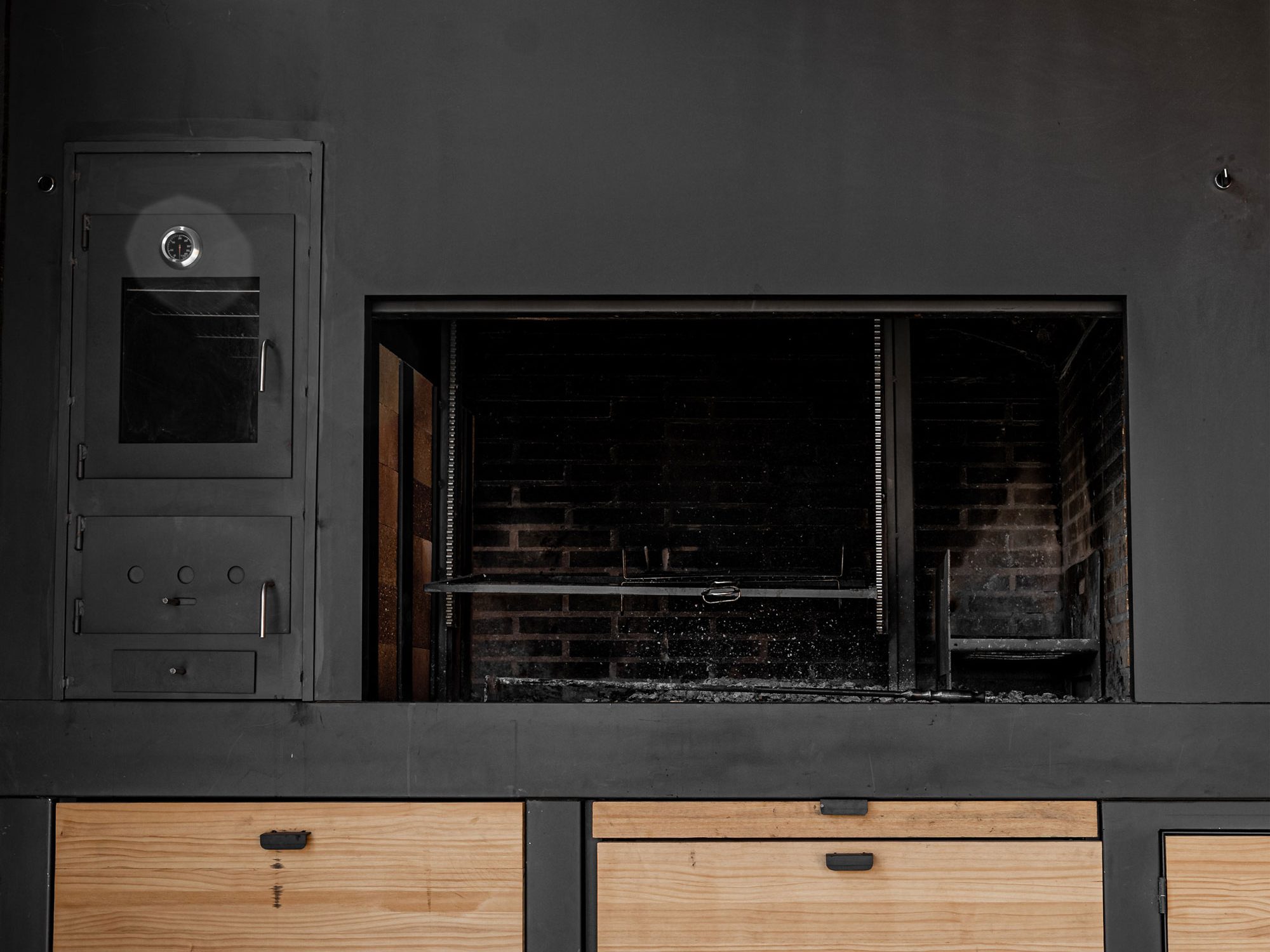 Fabricada en acero, hasta 5 mm de espesor; equipamiento dotado de elevación de parrilla Inox morotizada con recogedor de grasas desmontable. Iluminación interior, cierre corredero o de guillontina contrapesada, bandeja de apoyo extraible inox, cajones inox, cajón rodado para leña y zona de parrillas o utensilios.