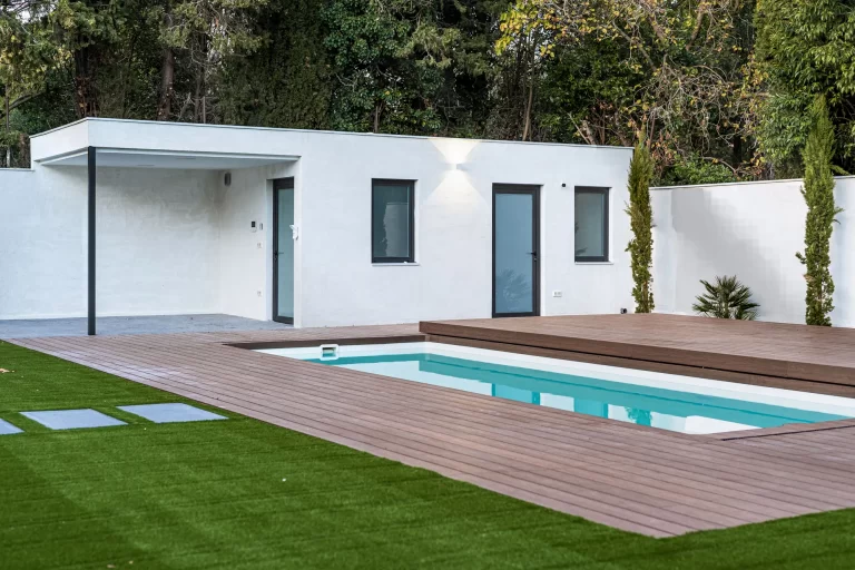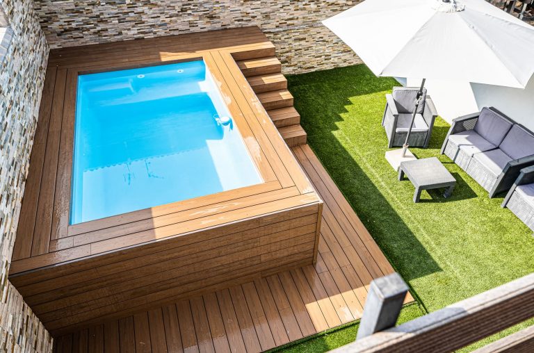 Proyecto de piscina elevada encajada a medida y forrada con material tecnológico.