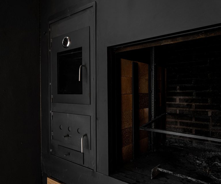 Asador con Parrilla, Horno y Brasas, cajones leñeros y bandejas para apoyo.