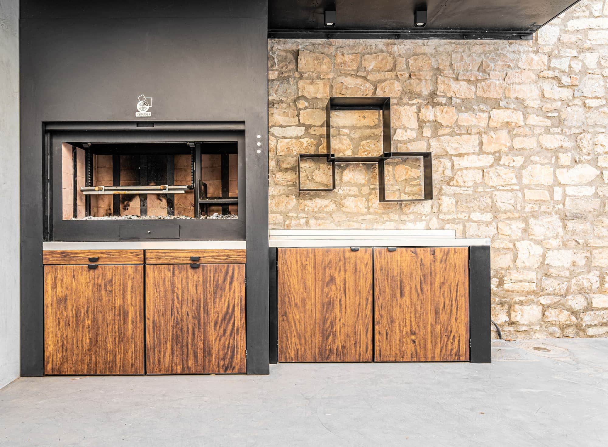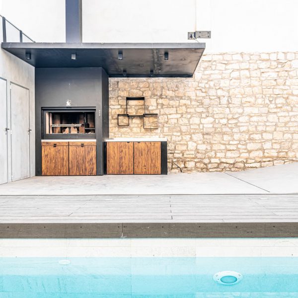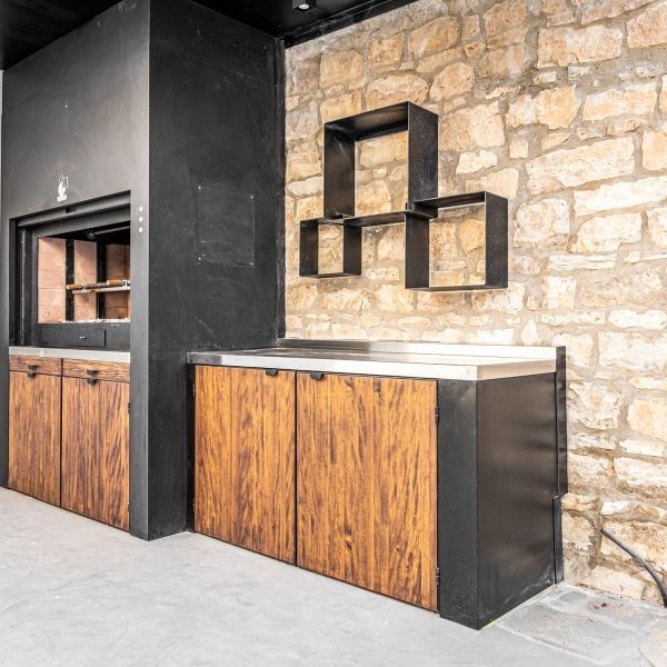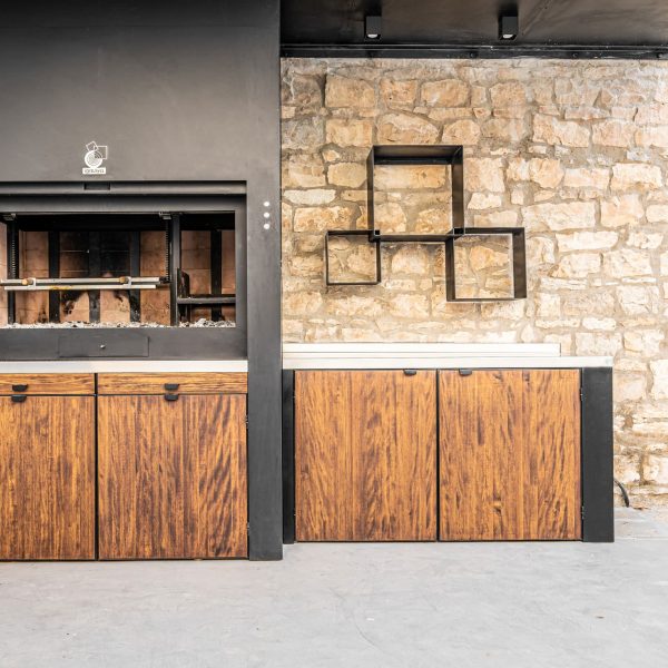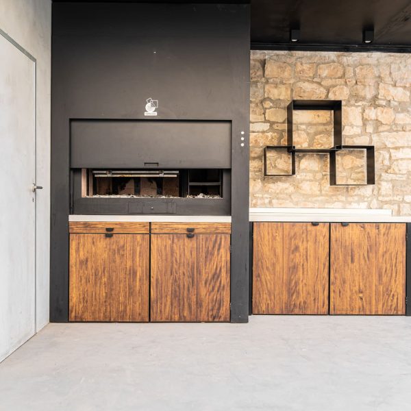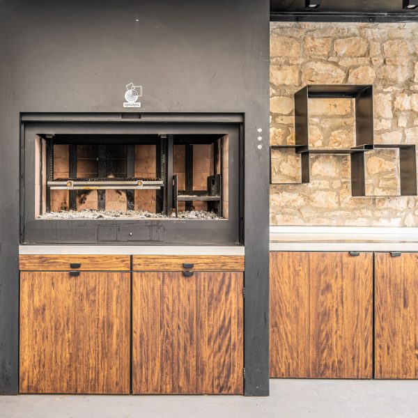 Espacio destinado para barbacoa, con asador, encimera, bandejas para apoyo de trabajo, leñero, tejado para protección de lluvia con iluminación.
