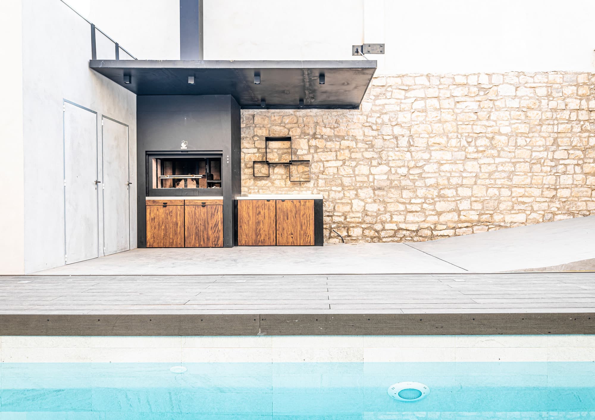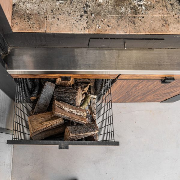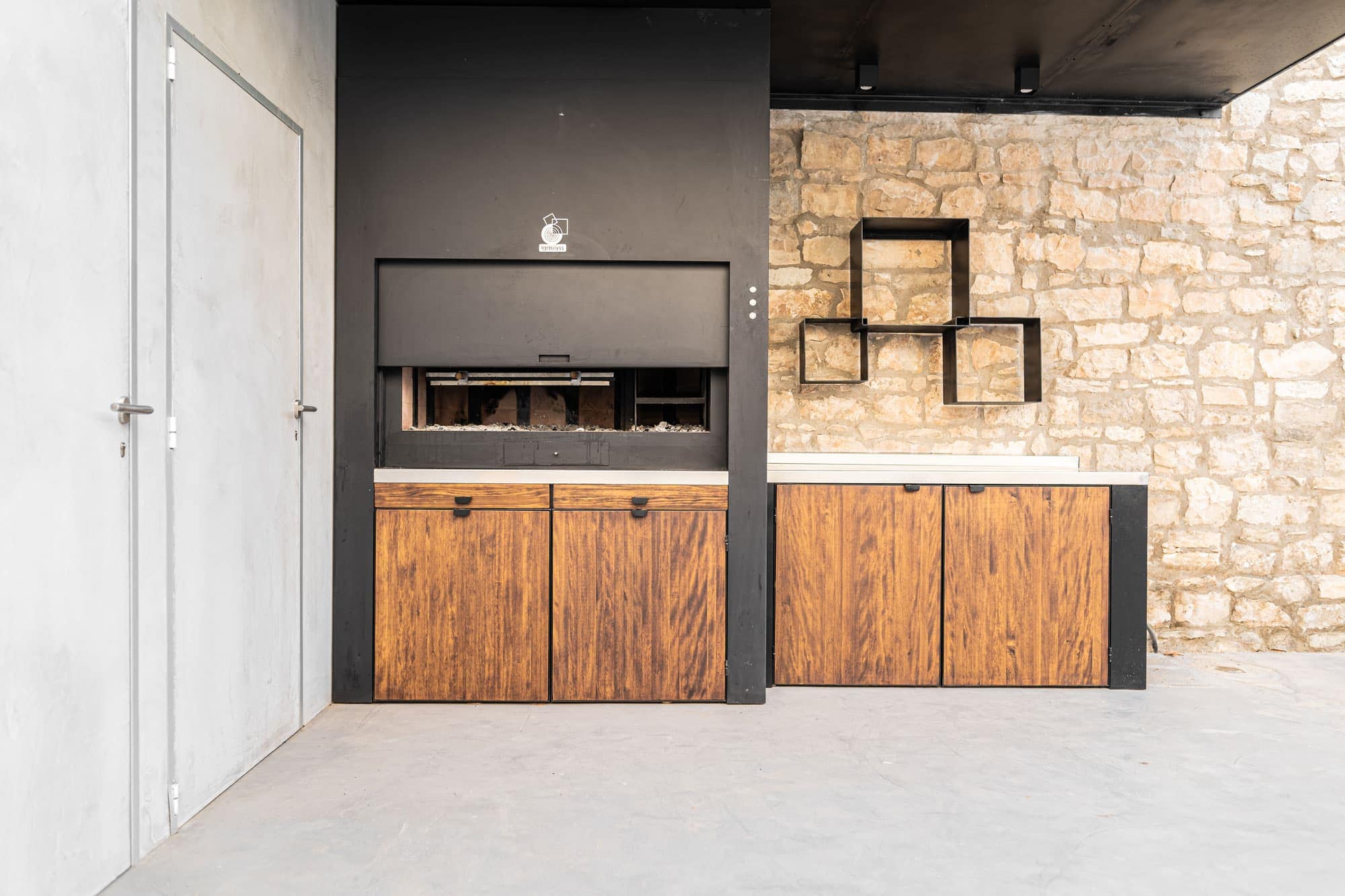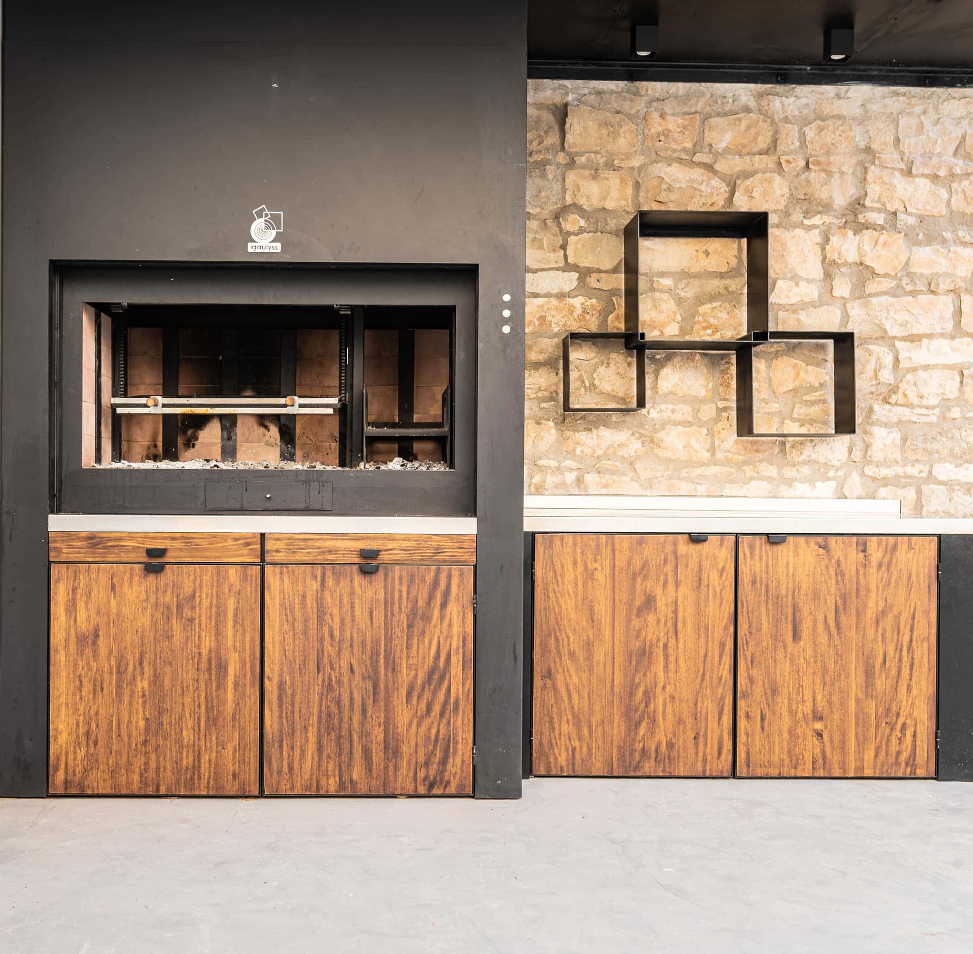 Espacio destinado para barbacoa, con asador, encimera, bandejas para apoyo de trabajo, leñero, tejado para protección de lluvia con iluminación.