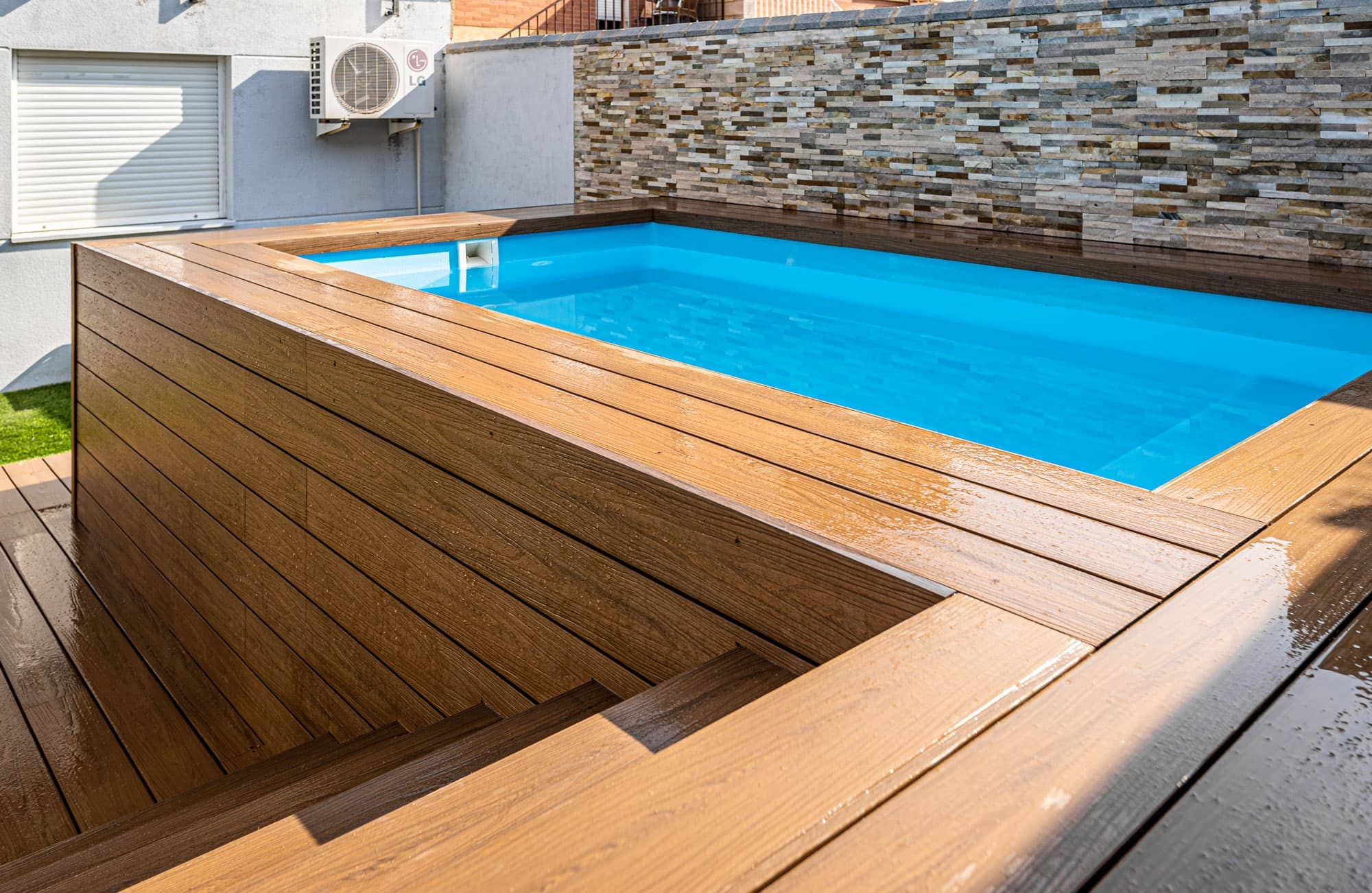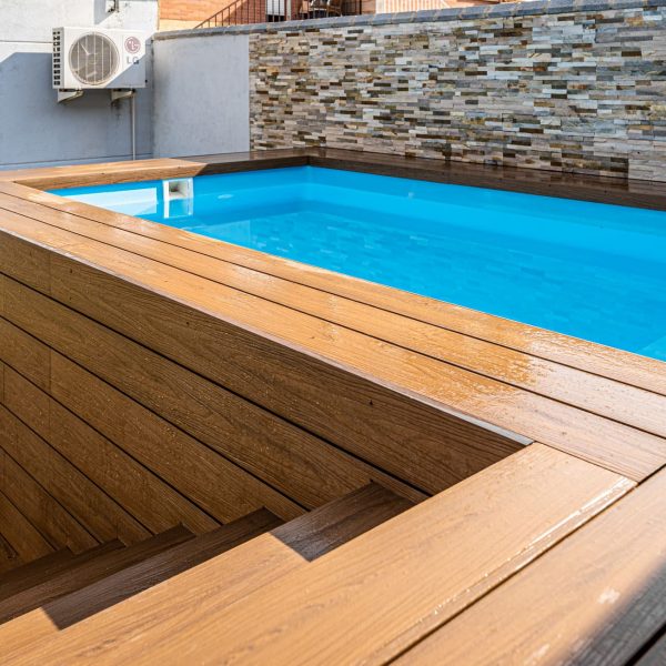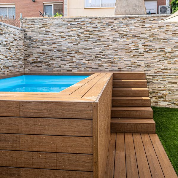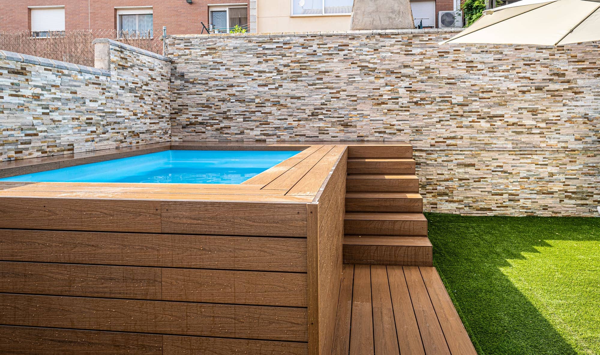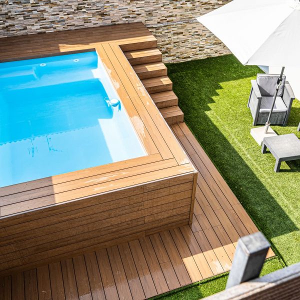 Piscina elevada para F&E Piscina elevada recubierta de paviemto tecnológico. Piscina elevada con escalera, recubierta con suelo tecnológico, cesped artificial y muro de ladrillo.