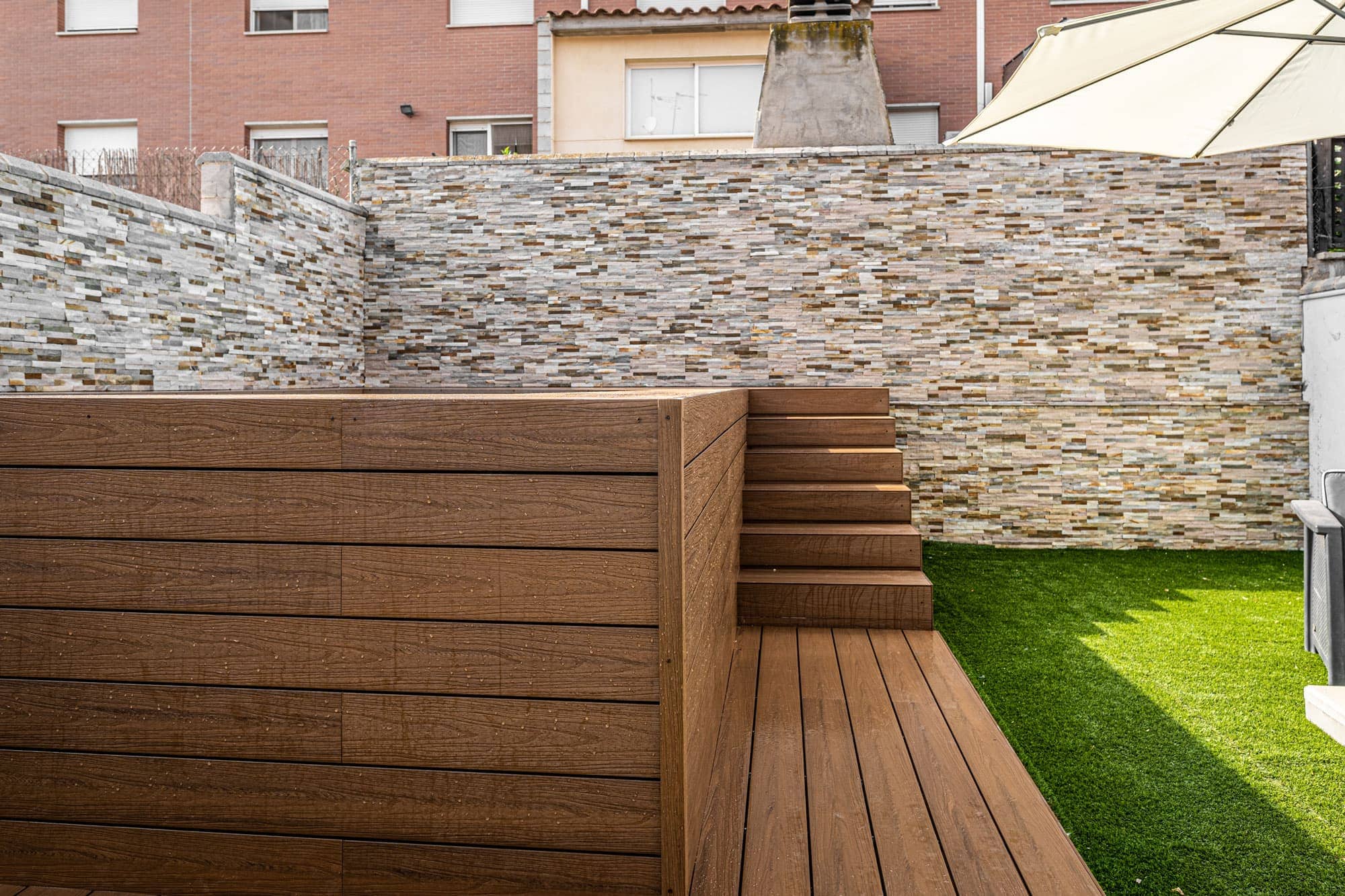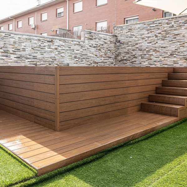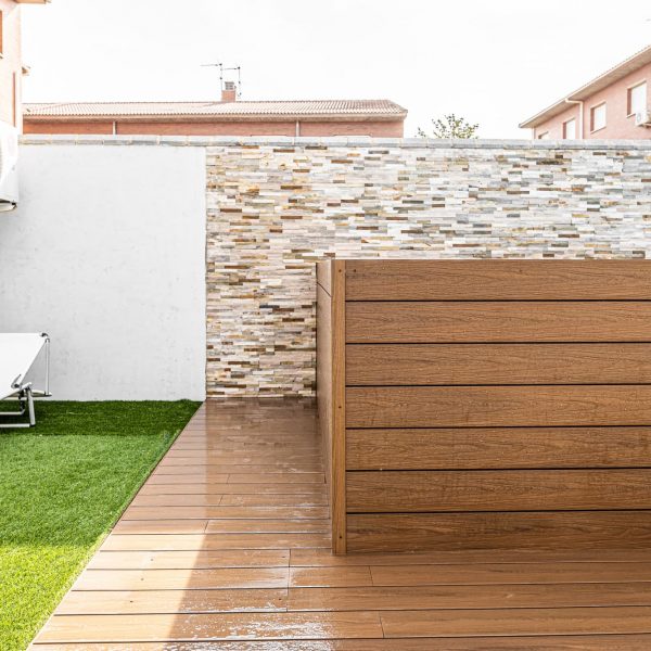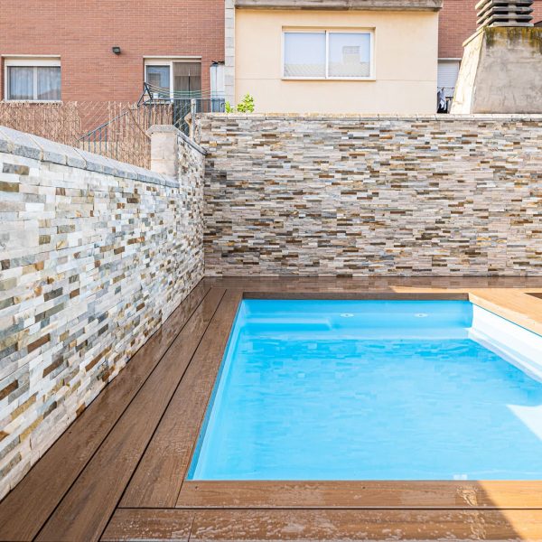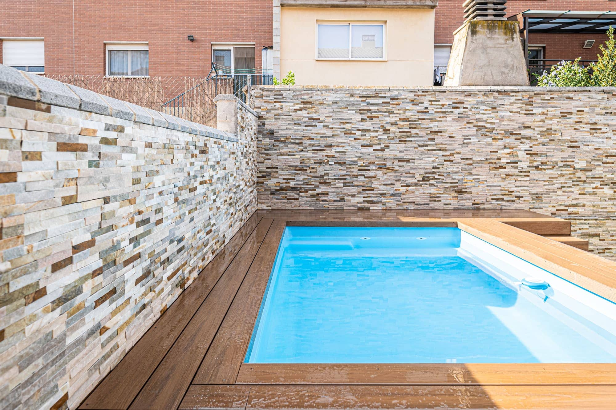 Piscina elevada para F&E Piscina elevada recubierta de paviemto tecnológico. Piscina elevada con escalera, recubierta con suelo tecnológico, cesped artificial y muro de ladrillo.